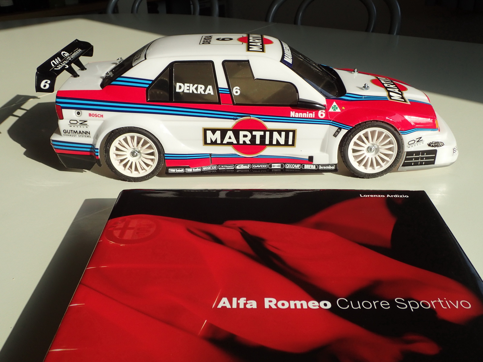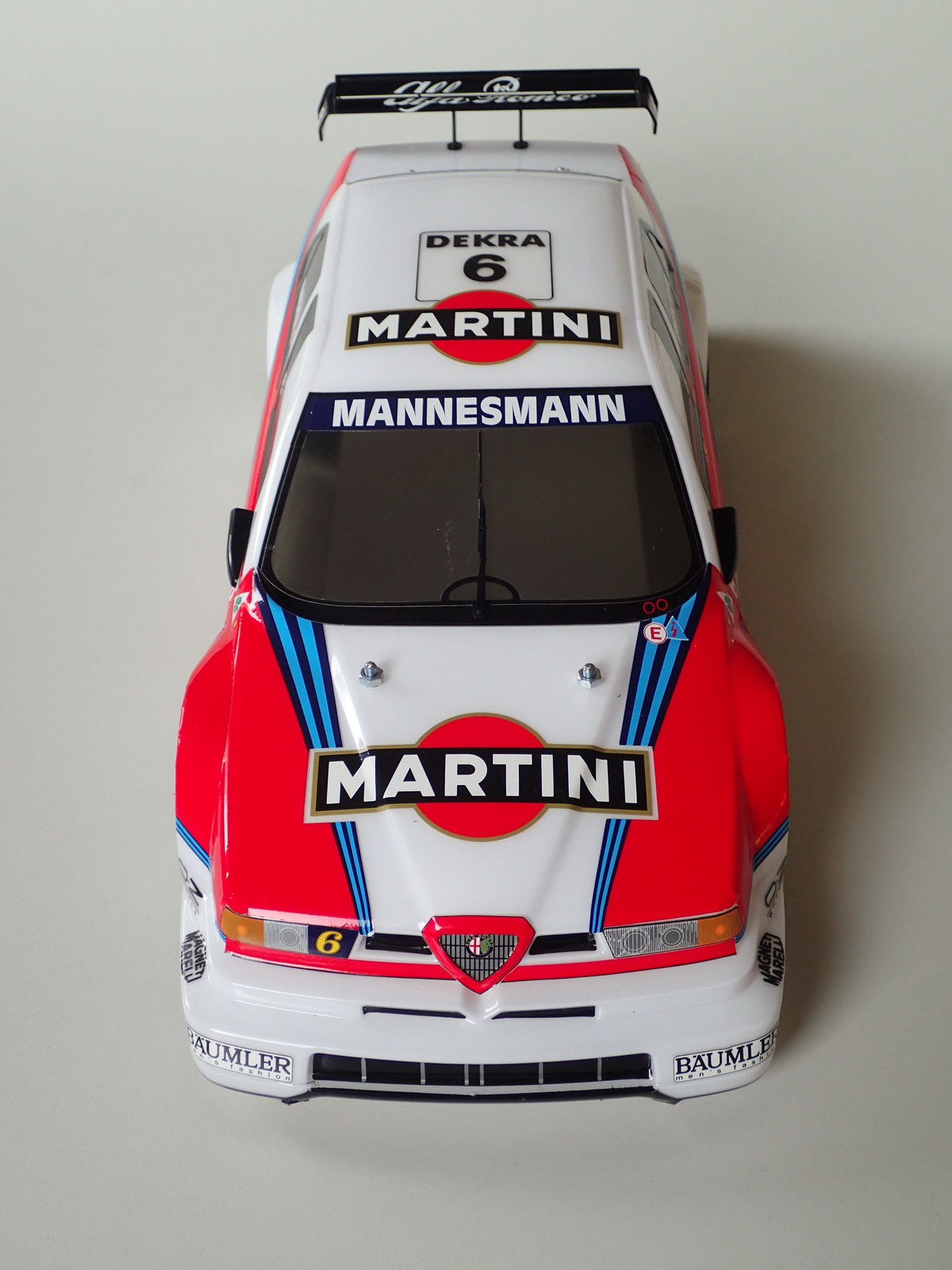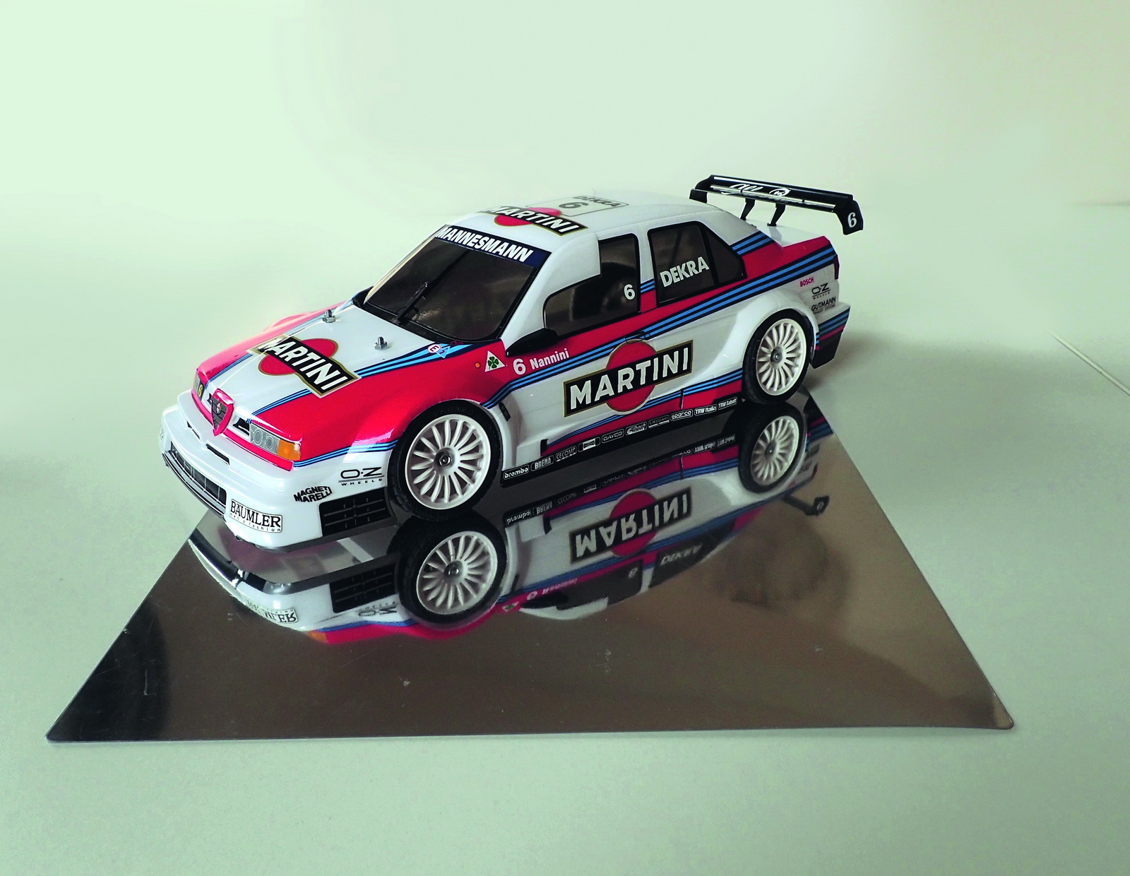 i co ciekawe, w tym stworzyła dwa minimalnie różniące się nadwozia. Na pozór wydają się identyczne, mają ten sam rozstaw osi 25,7 cm tymczasem różnią się wysokością położenia wnęk kół i przednimi osłonami zderzaków, przez co naklejki jednej wersji nie pasują do drugiej. Inne są też spoilery. Do tego przedstawiona poniżej wersja miała charakterystyczne białe owiewki na bocznych szybach. W naklejkach przewidziano wybór kierowców; z numerem startowym 5 jeździł Nicola Larini, a z nr 6 Alessandro Nannini. Gotowa Alfa 155 V6 TI prezentuje się bojowo, jakby miała zaraz wystartować do wyścigu.