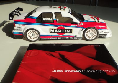 W latach 90 Alfa Romeo przystąpiła do walki w wyścigach samochodów turystycznych i miała świetne rezultaty zarówno w bardzo popularnych wówczas seriach DTM jak i ITC. Do wielkiego wyczynu dostosowała dość niepozornie wyglądający model 155, technicznie bazujący na Fiacie Tipo, odznaczający się kanciastym nadwoziem stylizowanym w ośrodku I.DE.A. Oczywiście wersja wyścigowa pokaźnie odbiegała od wydania seryjnego, o czym świadczy choćby fakt, iż wzdłużnie wstawiony silnik V6 napędzał 4 koła. W czasie kilku lat startów modyfikowano auto i pojawiali się nowi sponsorzy. Najlepiej, wręcz fantazyjnie, Alfa Romeo 155 V6 TI wyglądała w barwach Martini. Tamiya odzwierciedliła kilka wersji (Martini, Alfa Corse, Jägermeister, Bosch)