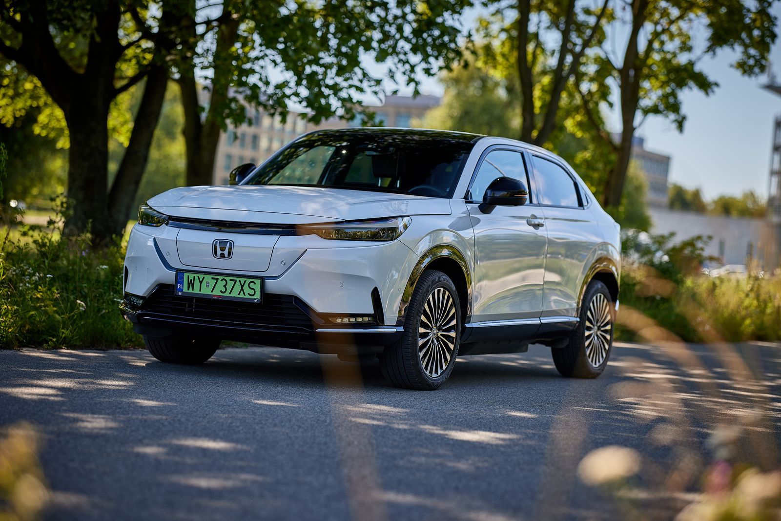 Jeśli mógłbym coś zmienić w Hondzie e:Ny1, to wolałbym zarówno klasyczną, krótką dźwigienkę biegów, jak również klasyczne klamki w drugiej parze drzwi. Nie przekonuje mnie symbol modelu – po angielsku wymawiany ‘ienłajłan’ a po japońsku ‘iniujoklan’. Szczerze mówiąc wolałbym krótszą, mniej skomplikowaną nazwę. Z pewnością nie zmieniałbym ogólnego designu. Podobają mi się felgi, które jak gdyby sygnalizują napęd elektryczny. Nawiasem mówiąc są one dobrze zabezpieczone wystającymi oponami i raczej nie powinny być uszkadzane podczas jazdy po dziurawej nawierzchni, bo toczą się 7,5 cm nad nią.