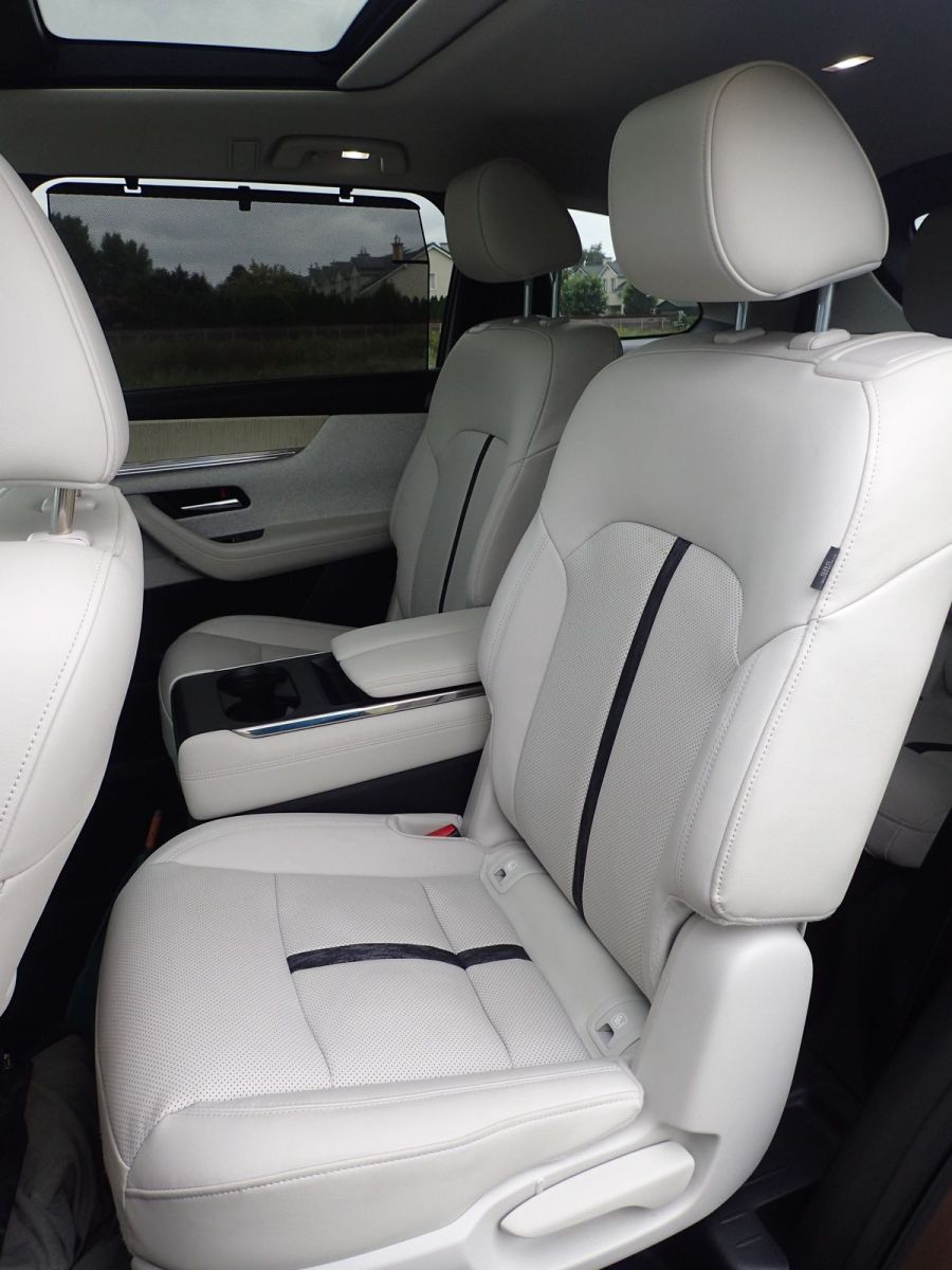 Rezygnacja z czarnych elementów zwykle pojawiających się w suvach i offroaderach świadczy o charakterze pojazdu. Jak widać postawiono na ‘czysty’ elegancki wygląd. To samo można powiedzieć o wnętrzu; jest ekskluzywne, materiały wysokiej klasy, jakość wykonania również. Przy tak dużym rozstawie osi i gabarytach spokojnie pomieszczono trzy rzędy siedzeń. Tak jak w większości suvów tej wielkości, dwa pierwsze rzędy zapewniają wygodne podróżowanie, trzeci pełni raczej funkcję rezerwowego, przy czym dzieci a nawet młodzież wcale nie muszą narzekać na brak miejsca na nogi i ogólnie na komfort jazdy – zwłaszcza, że wsiadanie ułatwia odchylenie oparcia siedzenia drugiego rzędu, a gdy go jeszcze przesuniemy do przodu, to wsiadanie jest w miarę ok. Wszystkie przesuwne siedzenia ułatwiają aranżację wnętrza, w zależności od liczby osób na pokładzie oraz ilości bagażu. Mimo wysoko położonej podłogi (75,5 cm od nawierzchni), bagażnik mieści 687-1971 litrów. Wysoko jest też położona podłoga na całej długości wnętrza. Przed przednimi fotelami jest to 39,5 cm nad nawierzchnią, przed drugim rzędem 41,4 cm, a przed trzecim 53 cm. Jeszcze ważniejsze jak wysoko nad podłogą siedzimy. Otóż z przodu jest to w zależności od regulacji fotela od 17,5 do 24,5 cm. W drugim rzędzie 24,5 cm, natomiast w trzecim ekstremalnie nisko 14,5 cm. Siłą rzeczy chcielibyśmy mieć więcej miejsca na nogi. Tu się potwierdza fakt, iż suv z wysoko umieszczoną podłogą z tyłu zasługuje na określenie konfiguracji wnętrza 5+2. Oczywiście z przodu odczuwamy wysoki komfort jazdy – coś na wzór business class. Kierowca z pewnością nie narzeka na swoje miejsce. Wszystko co z nim związane jest ergonomiczne i czytelne. Uwagę zwraca powrót do sterowania funkcjami monitora jednym dżojstikiem w postaci pokrętła, będącym też przyciskiem zatwierdzającym. Znajduje się on w poręcznym miejscu na wysokim i szerokim ‘mostku kapitańskim’ – czyli konsoli środkowej. Wolę taki układ niż dotykowy monitor, bo nie muszę się nachylać w czasie prowadzenia auta. Co prawda w obu rozwiązaniach trzeba wizualnie zlokalizować piktogram konkretnej funkcji, ale nie musimy trafiać na niego bezpośrednio palcem. Tak czy inaczej najlepiej jest się nauczyć obsługi głosowej, aczkolwiek ona też mogłaby się poduczyć, bo nie wszystko rozumie.