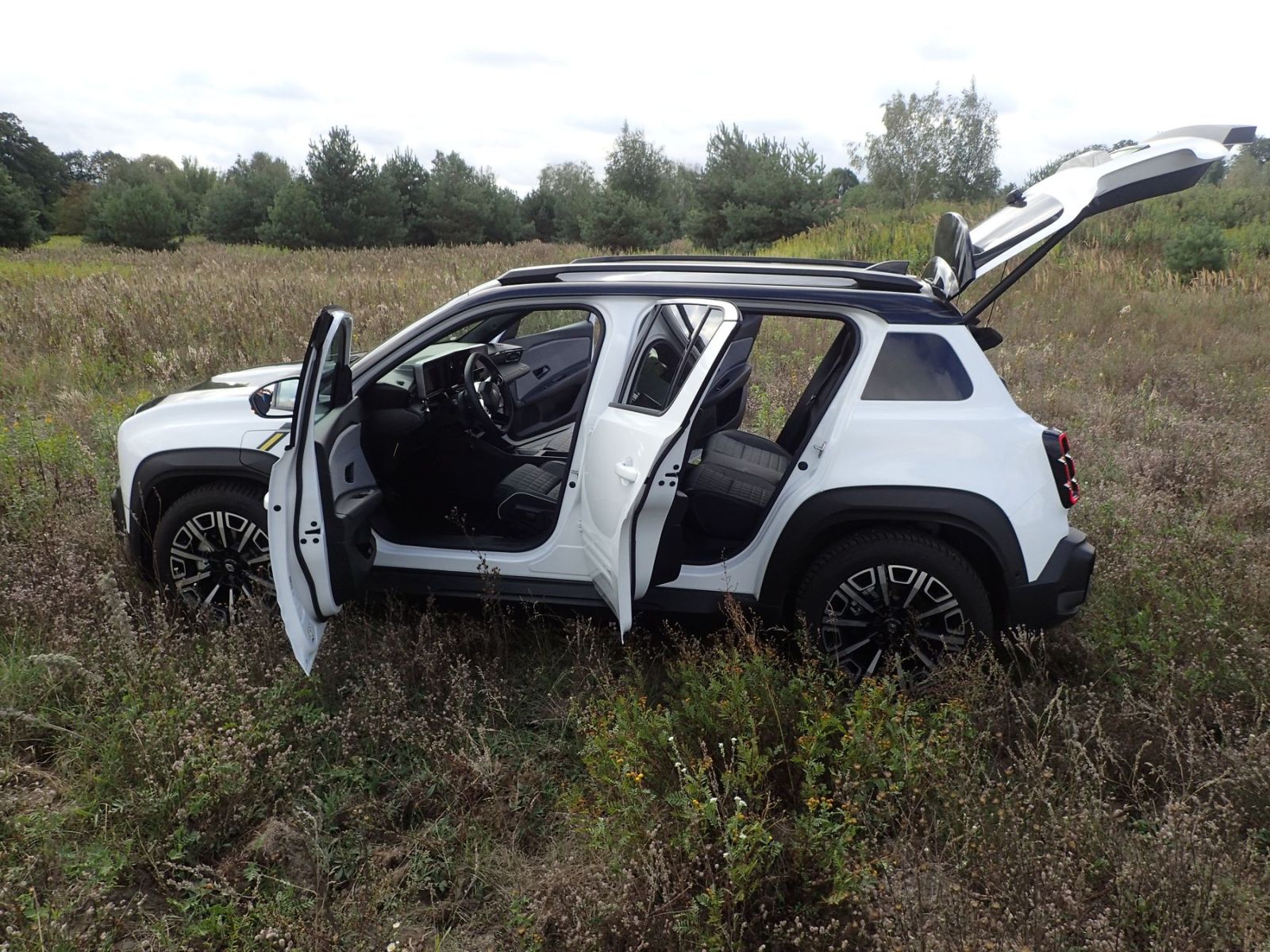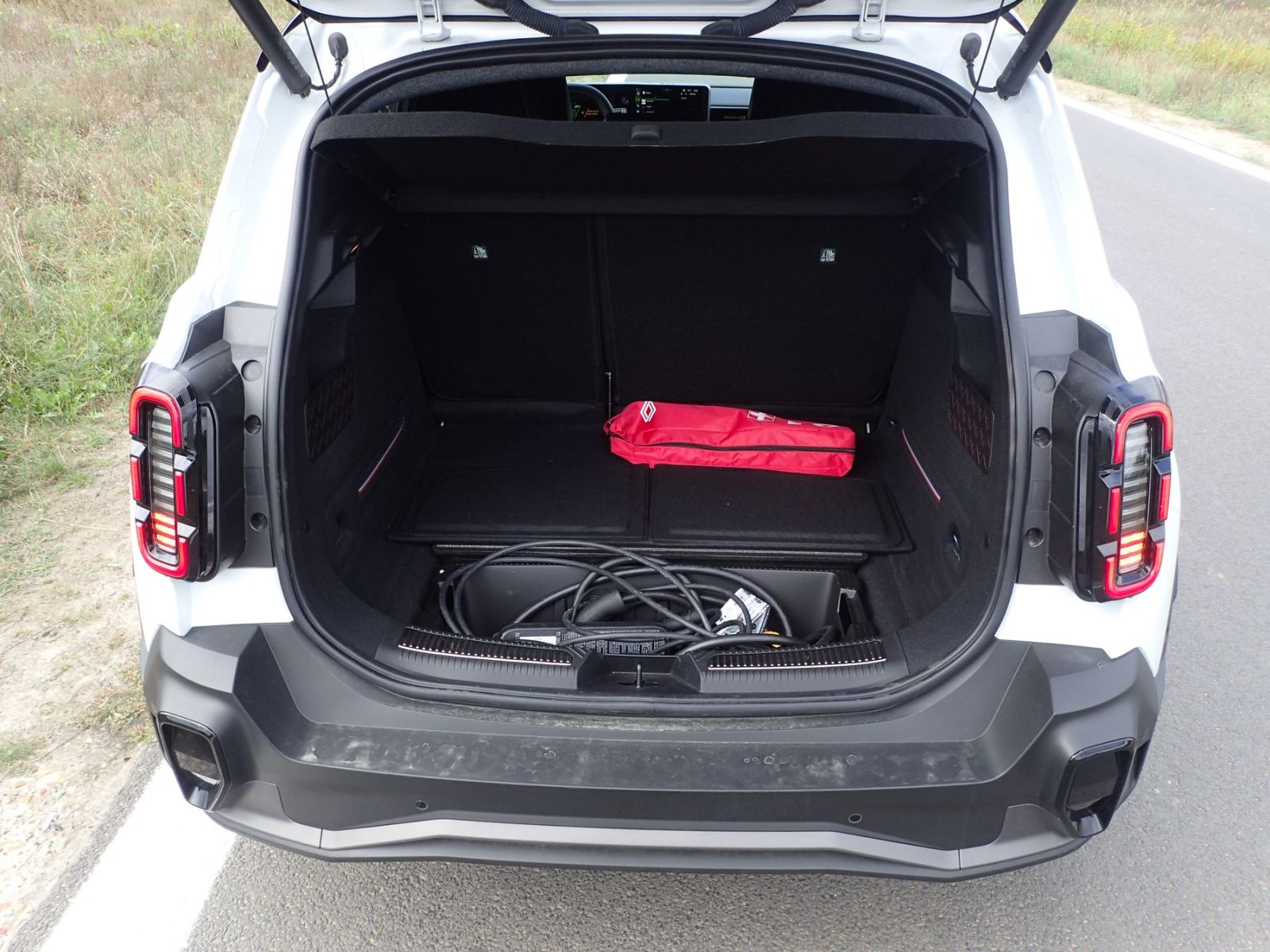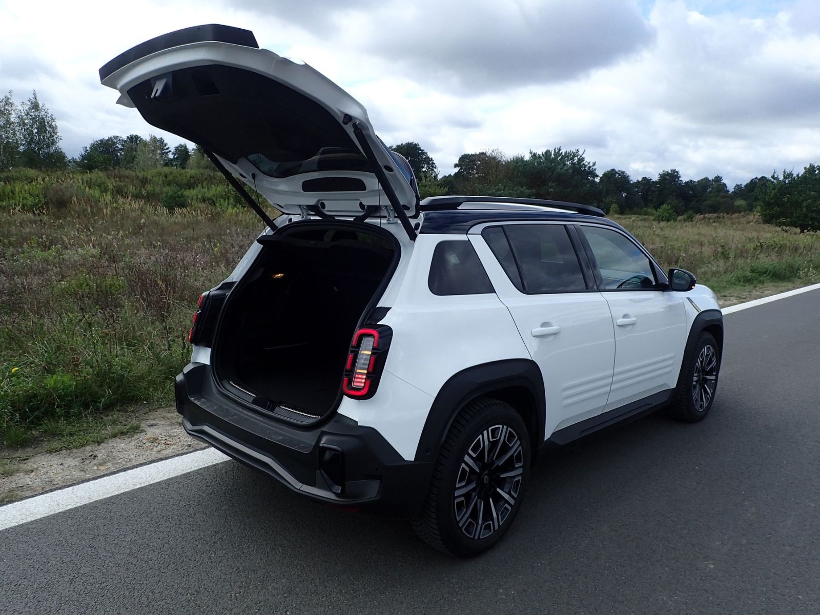 Gdybym mógł coś jeszcze zmienić, zmniejszyłbym lewy narożnik deski rozdzielczej wystający 26 cm z otworu drzwiowego. O ile wsiadając kierowca może trafić na niego kolanem, mała szansa byśmy otarli o krawędź dachu, położoną 138 cm nad nawierzchnią (pomiar po otwarciu drzwi). Wysokość wnętrza mierzona od górnej krawędzi przedniej szyby do podłogi to 104 cm, natomiast szerokość na wysokości łokci sięga 137,5 cm. Z kolei odległość podłogi od nawierzchni to 36,5 cm. Oparcie fotela oddalone jest od pedału hamulca (max) o 108,5 cm, przy cofniętym fotelu między oparciami z tyłu pozostaje 61 cm. Miejsca jest więc sporo, a do tego duży i ustawny jest bagażnik (420-1405 litrów). Jego podłoga znajduje się na wysokości 59,5 cm. Pod nią mieszczą się szuflady porządkowe (30 litrów) np. na ładowarkę z przewodem. Mierząc od spodu, pokrywa bagażnika unosi się elektrycznie na wysokość 183 cm (zamek), natomiast osoby o wzroście powyżej 192,5 cm muszą uważać na głowę, bo z klapy wystają ‘uszy’ z ostrymi krawędziami.