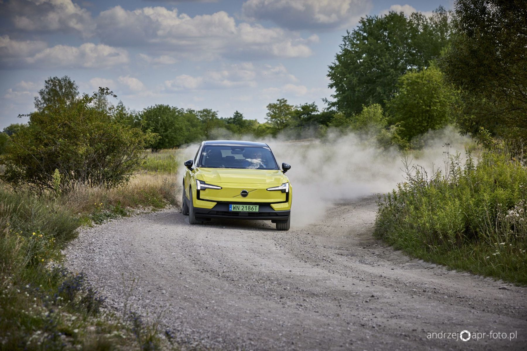 Volvo EV30 występuje w wersji jedno i 2-silnikowej. Do testu otrzymaliśmy tę pierwszą o mocy 272 KM i akumulatorze 69 kWh – czyli Single Motor Extended Range. Mimo pozorów i masy 1865 kg auto nie jest ociężałe, o czym świadczy choćby sprint do setki w 5,3 s do 100 kmh (Vmax 180 kmh). Ponieważ przyspieszeniu towarzyszy cisza w kokpicie, więc efekt – zwłaszcza dla osób po raz pierwszy poddawanych takiej próbie – robi piorunujące wrażenie. Aż strach pomyśleć co by się działo w wersji 2-silnikowej (428 KM, 3,6 s do 100 kmh). Producent chwali się zasięgiem maksymalnym 480 km. Przy odbiorze akumulator był naładowany w 80% a zapowiadany przez komputer pokładowy zasięg to 390 km. Po pokonaniu dystansu 214 km zasięg spadł o 255 km, więc akumulator podładowałem na stacji Greenwaya. Następnie przejechałem jeszcze 131 km, zasięg na tym odcinku testu spadł o 182 km. Pozostaje dodać, że był to okres temperatur bardziej charakterystyczny dla Afryki niż Europy.