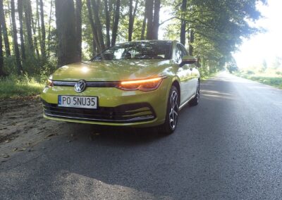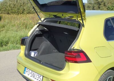 Twórcy najnowszej – 8 generacji Golfa starali się by te cechy nadal mu towarzyszyły. Teraz styliści mieli ułatwione zadanie, bo nowoczesną sylwetkę przypisano modelowi ID.3, natomiast Golf z założenia ma kontynuować spokojną ewolucję. Nic dziwnego, że nasz testowy egzemplarz zwracał uwagę wyłącznie metalizowanym kolorem ‘żółta limonka’, a kto nieco lepiej orientował się w nowościach, rozpoznawał go po przednich światłach.